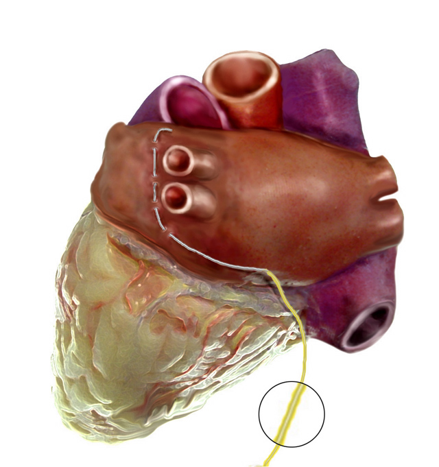 The right atrial pacing wire (black/blue) is placed after the right cardioversion wire. The wire is placed on the atrial appendage. The wire is placed in a linear fashion with 2-4 bites of the atrial epicardium. The needle from the wire is cut and small crimp is made in the distal end of the wire. The wire is then brought out through the right side of the chest and secured to the skin with suture.