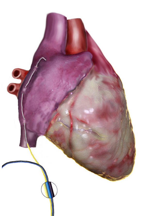 The left atrial cardioversion wire (yellow) is placed first, before the operation is performed. The heart while still beating is lifted anteriorly and rotated to the right of the patient using a suction exposure device. The wire is the placed in a similar fashion described above for the arrested heart.
