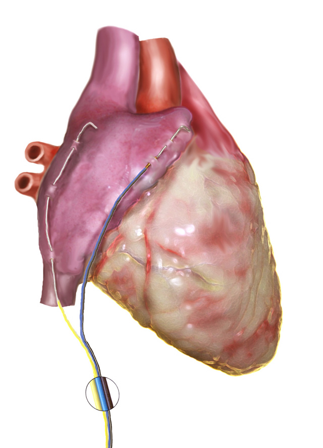 The left atrial cardioversion wire (yellow) is the first wire to be implanted on the heart. It is placed before the valve repair/replacement or after the distal circumflex grafting is performed. The heart is lifted in order to have adequate exposure of the left pulmonary veins. The wire is attached to the left atrium anterior to and within 5mm of the left superior pulmonary vein. The wire is placed in a linear fashion with 2-4 bites of the atrial epicardium. The needle from the wire is cut and small crimp is made in the distal end of the wire. The wire is then draped over the dome of the left atrium or atrial appendage. This will allow 3 to 5 cm of wire to contact the epicardium. The wire is then brought out through the right side of the chest and secured to the skin with suture. A cardioversion connector is attached to the wire.