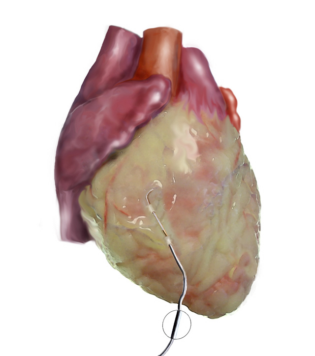 The ventricular pacing wire (black/white) is placed last using the arrested heart or beating heart technique. The wire is placed on the right or left ventricle. The wire is placed in a linear fashion with 2-4 bites of the atrial epicardium. The needle from the wire is cut and small crimp is made in the distal end of the wire. The wire is then brought out through the left side of the chest and secured to the skin with suture.
