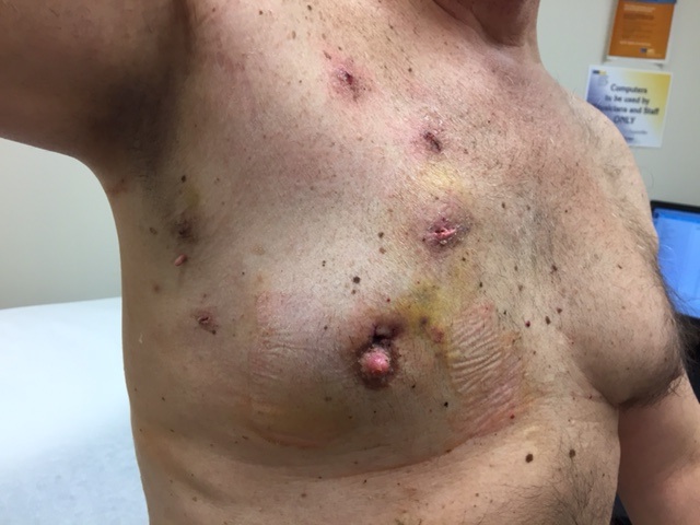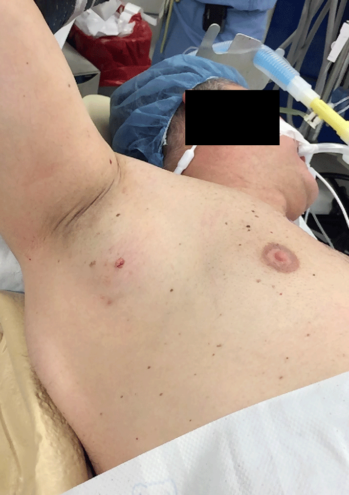 A 50-year-old male presented with a history of being evaluated for a right chest wall hematoma that occurred while he was lifting weights in the distant past. At that time, he described a bursting sensation during exercise and mild pain. He was evaluated at an outside emergency room, underwent cross sectional imaging, and was diagnosed with a chest wall hematoma.