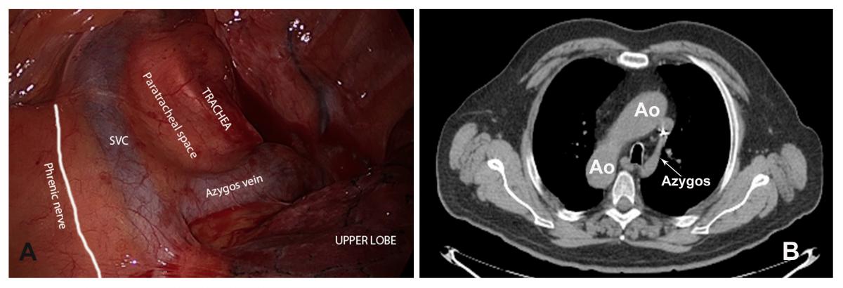 Surgical technique:The patient was placed in a right lateral decubitus position. An uniportal video-assisted thoracoscopic approach through a single 4 cm incision was made in the left 5th intercostal space with no rib spreading. The left lung composed of three lobes and vascular and bronchial anatomy was exactly as a normal right side lung. Azygos vein, superior vena cava, and paratracheal space were mirror images of normal condition (Fig. 1A,B).