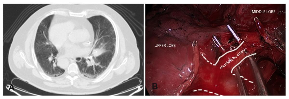 A 3cm mass was located in the middle lobe (Fig. 2A), too large and deep to perform a wedge resection so a middle lobectomy (Fig. 2B) with complete lymphadenectomy was performed (paratracheal and subcarinal space). A single chest tube was placed in the posterior part of the incision.