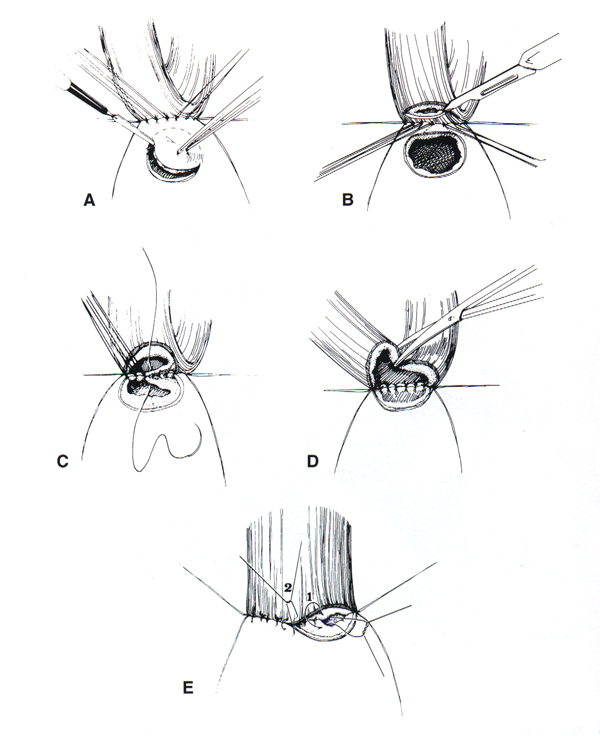 An upper midline laparotomy incision is used. The incision should extended cephalad over the xiphoid to the lower sternal region. The abdomen is explored. An upper hand retractor is used with two blades. On the left, a bladder blade lifts the inferior sternum cephalad and upwards off the table. On the right, a malleable blade retracts the mobilized left hepatic lobe tip to the right to facilitate exposure of the esophageal hiatus and E-G junction. A standard balfour abdominal retractor completes the exposure. Gastric mobilization is performed preserving only the right gastroepiploic arcade (Figure 2). A 1 inch latex drain, which is used early to encircle and suspend the stomach from the upper hand retractors, is helpful with this portion of the procedure. The left gastric vessels may be exposed and ligated posteriorly through the lesser sac, or anteriorly through the divided gastrohepatic ligament. I prefer the anterior approach. I individually ligate and divide each vessel with silk ligatures. Others choose to staple or use the harmonic scalpel to divide the short gastric vessels. Once the stomach is completely mobilized, a Kocher maneuver is added to straighten the duodenum. This will help easy passage of the stomach to the neck. A pyloric drainage procedure is routinely added. I prefer a pyloromyotomy, which I fashion using the electrocautery set on low power, and which is secondarily covered by an omental patch (Figure 3).