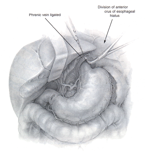 The majority of the esophageal mobilization is performed from below, through the esophageal hiatus (Figure 4). It helps, therefore, to widen the hiatus. I prefer to suture ligate the crossing phrenic vein, and then open the hiatus anteriorly. Be careful not to open the adjacent pericardium.