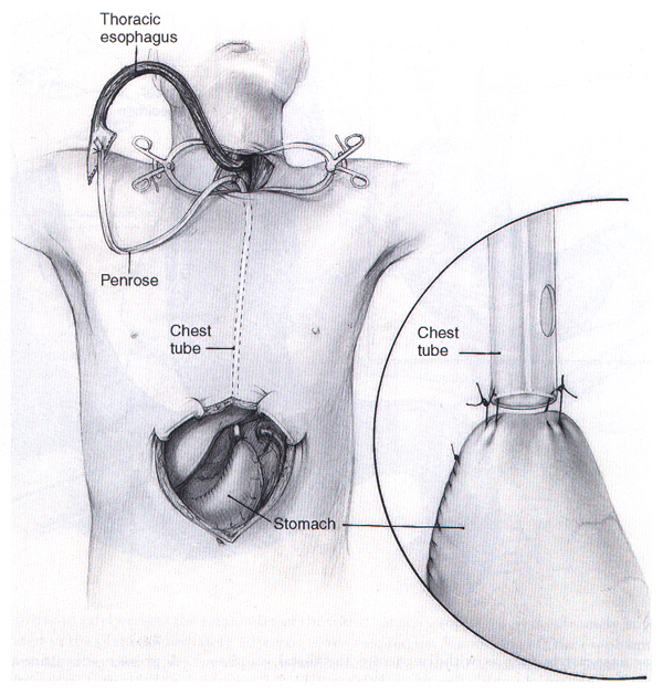 Before completing the anastomosis, the nasogastric tube is directed across it under direct vision and secured into place. When the anastomosis is finished, the chest tube traction sutures are cut and the stitch sites are inverted with Lembert or purse-string sutures. A gentle tug on the stomach tube from the abdomen delivers the anastomosis to the midline, prevertebral space.