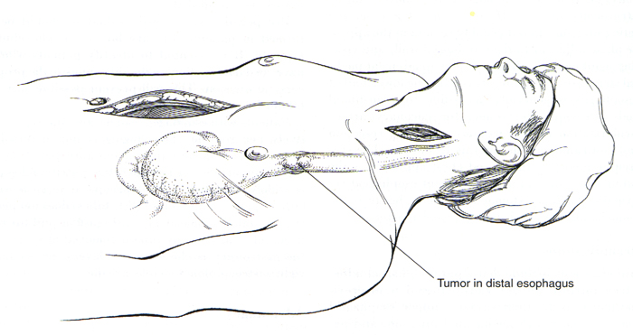 Patients who are particularly thin, even if they meet the criteria above, may not be ideal candidates for THE as blunt dissection in these patients may cause profound hemodynamic compromise. This problem is strictly mechanical, as there simply is not enough room for the surgeon's hand and the heart in thin patients with a narrow A-P diameter of the chest. The most extreme example would be patients with pectus excavatum. Patients who have had previous neck surgery or irradiation, may not be candidates for this technique as the cervical esophagus is not accessible for mobilization and anastomosis. Of note, patients who have undergone prior median sternotomy, as for open heart surgery, remain candidates for THE provided that the above two criteria are met. I have also found that prior PEG tube placement has not prevented gastric mobilization and use.